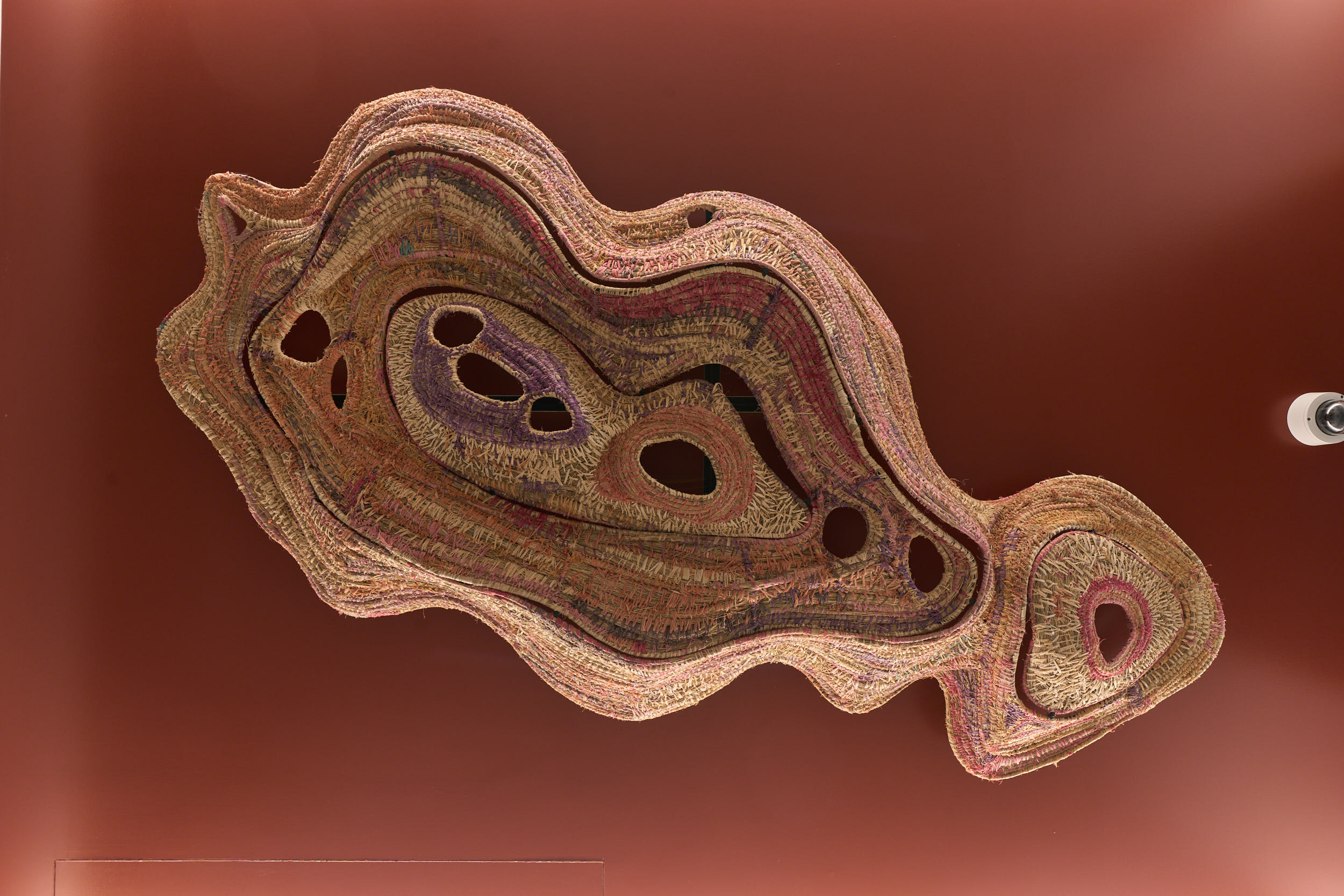 The woven sculptures are suspended from the celing thought the Department of Infrastructure and Transport. The weavings depicts the country and colours of the APY lands. The artworks are based on the many rock holes and rocks piles that are scattered across the landscape around Mimili and Indulkana.