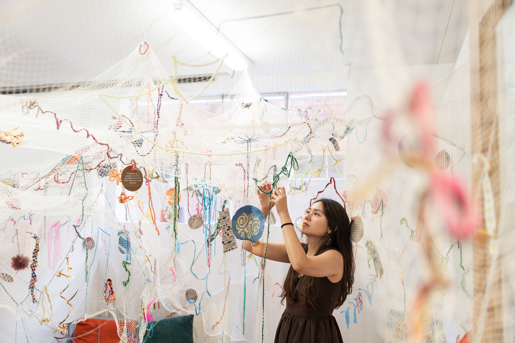 The Guildhouse Collections Project with FABRIK gave Dai Trang the unique opportunity to engage with the living heritage of FABRIK. Over six months, Dai Trang developed an ever-evolving participatory installation encouraging visitors and members of the public to contribute to this collective creation by threading and weaving yarn, fabric and textiles into the piece.