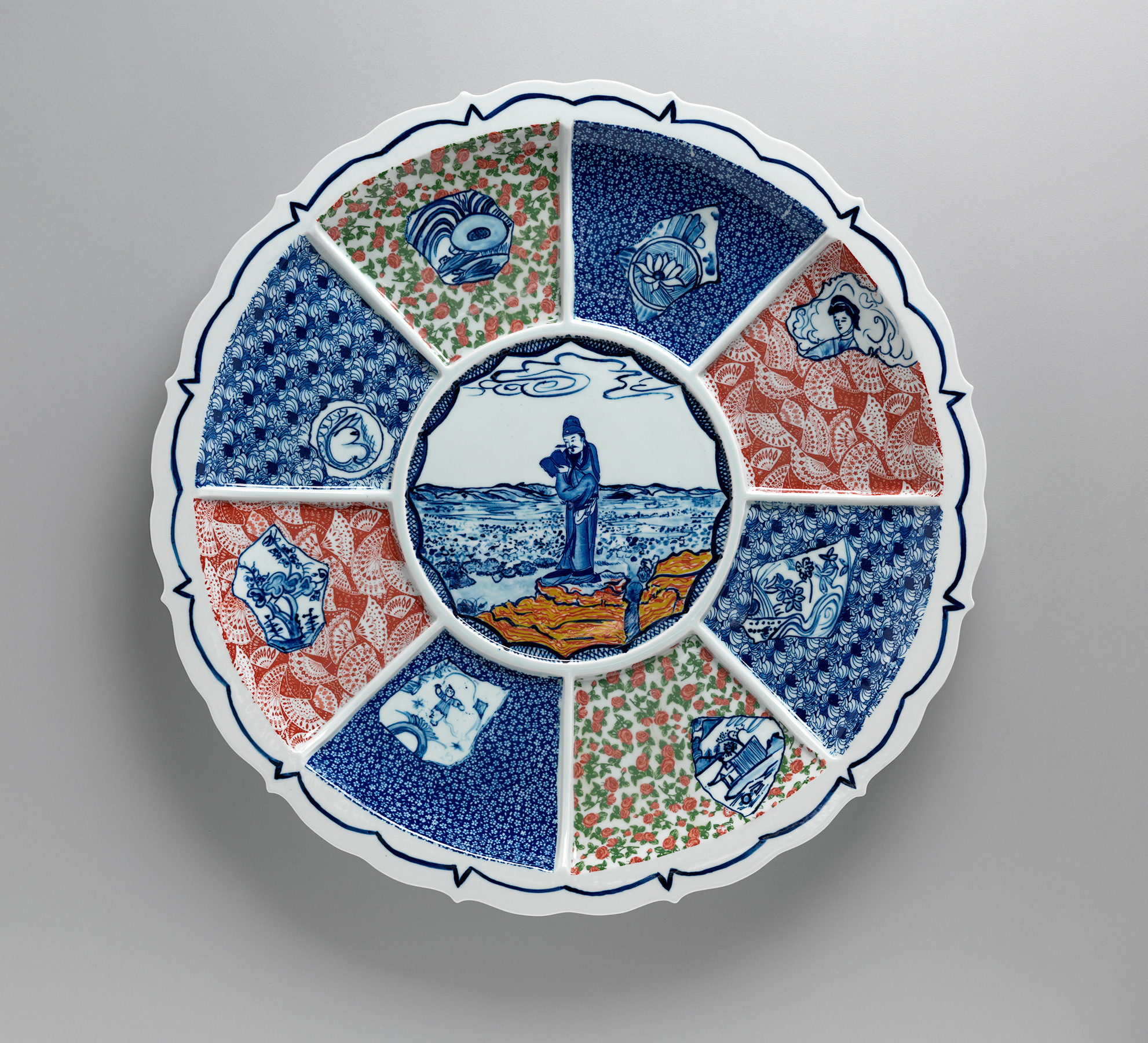 Gus Clutterbuck, Self Portrait as Li Bai, 2016 (Jingdezhen, China), porcelain platter, cobalt and underglaze decoration, decals, glaze, 1000mm diameter x 110mm, photo by Grant Hancock.
