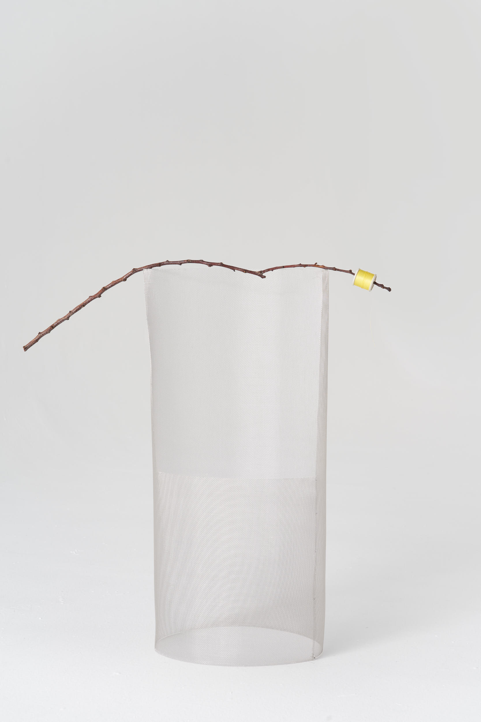Image: Sonja Porcaro, Passaggio/Passage (detail), 2024, stainless steel mesh, gleaned apricot branch, vintage cotton spool, photo by Sam Roberts