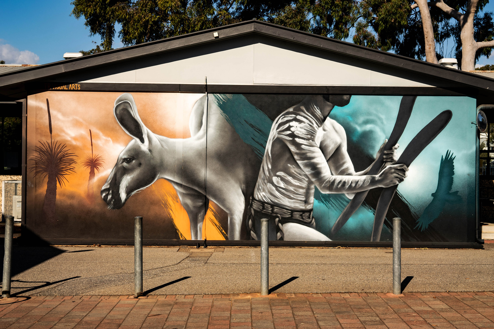 Images: Thomas Readett, Irrabinna Centre Mural, 2023, aerosol, image by Threesix Imagery.